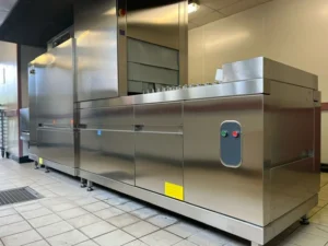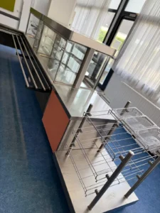 Nous avons accompagné de nombreuses collectivités dans leurs projets de cuisine collective. Écoles primaires, collèges, lycées, EHPAD, établissements médico-sociaux ou encore cuisines centrales : nos équipes conçoivent des espaces de production adaptés à chaque besoin. À titre d’exemple, nous avons récemment réalisé la rénovation complète d’une cantine scolaire dans une école élémentaire en région parisienne, avec un aménagement ergonomique avec le self Bambin de la gamme Franstal Gold de chez Tournus, ainsi que deux vitrines bambin sur réserve 1 porte Gn2/1 avec retour façade sur mesure pour bain-marie. Ou encore l’installation d’un convoyeur automatique de chez Comenda pour le lavage des bacs gastro et cagettes de transport pour une cuisine centrale en région parisienne.